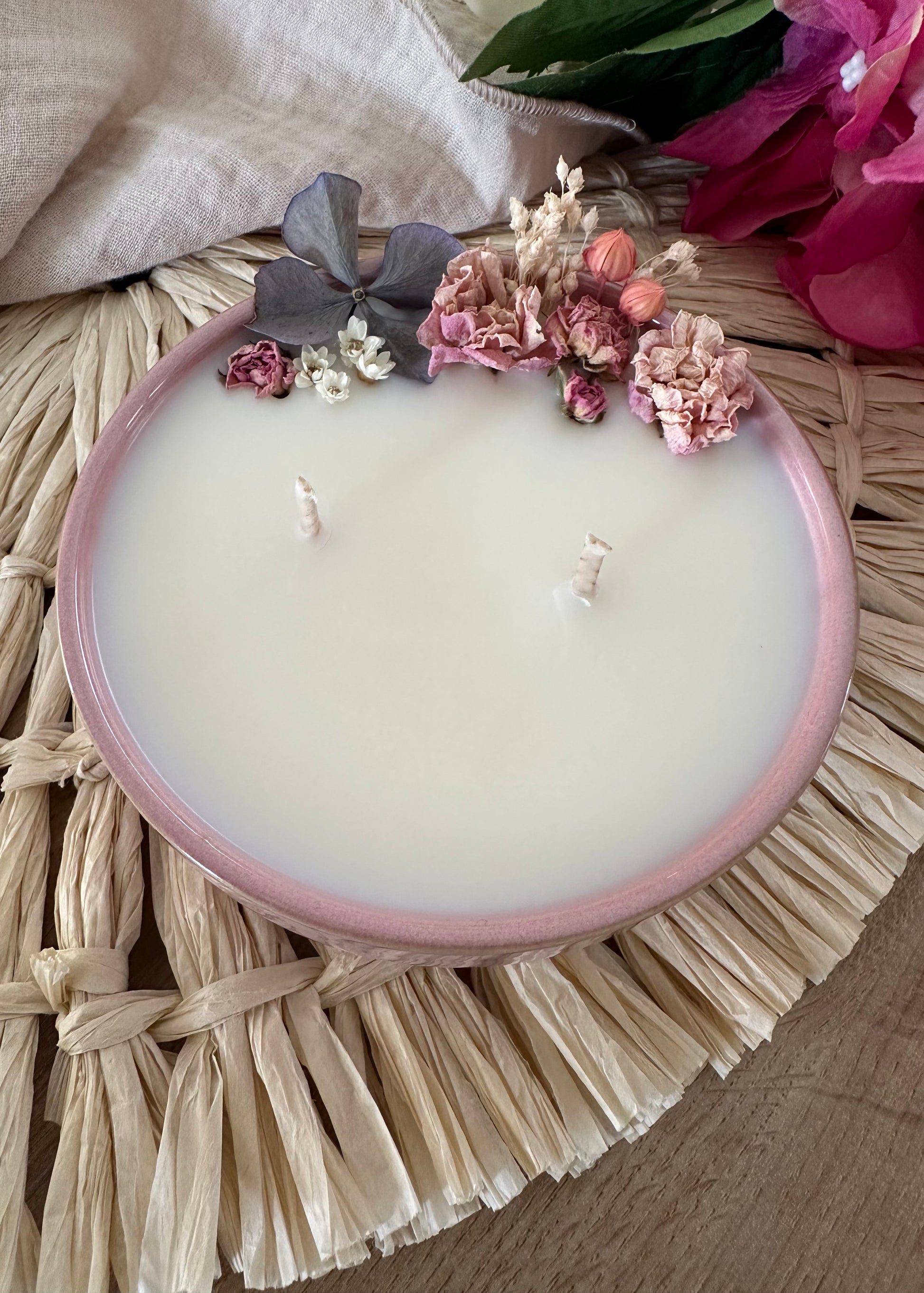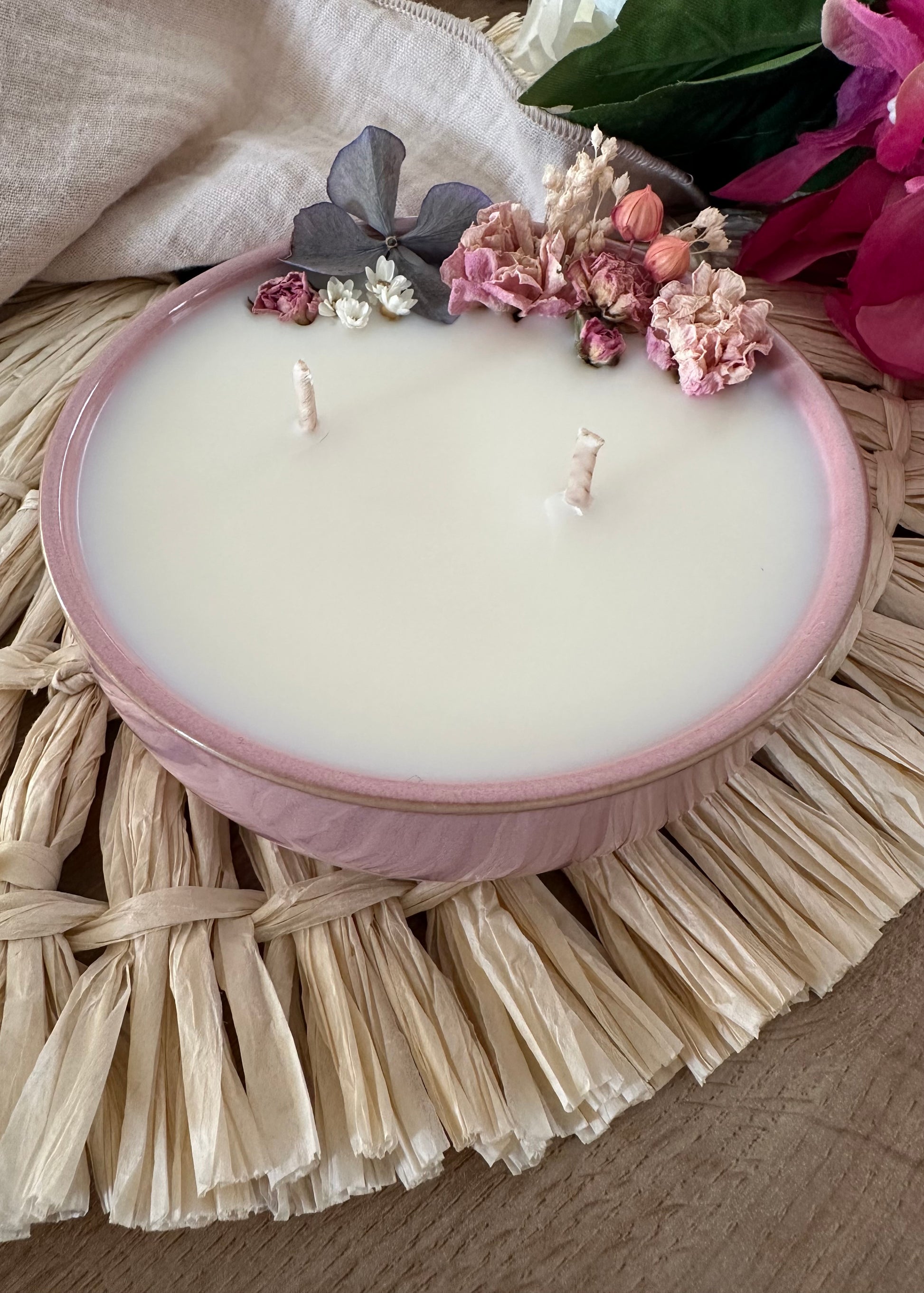 💗 Chaque bougie étant unique, les compositions florales peuvent légèrement varier d’une bougie à l’autre, tout en respectant le même univers de couleurs et de senteurs rose vanillée.