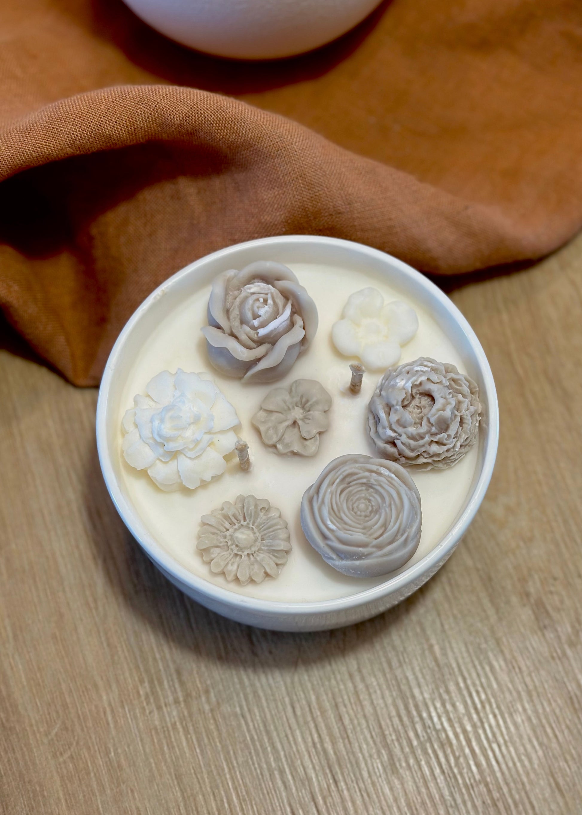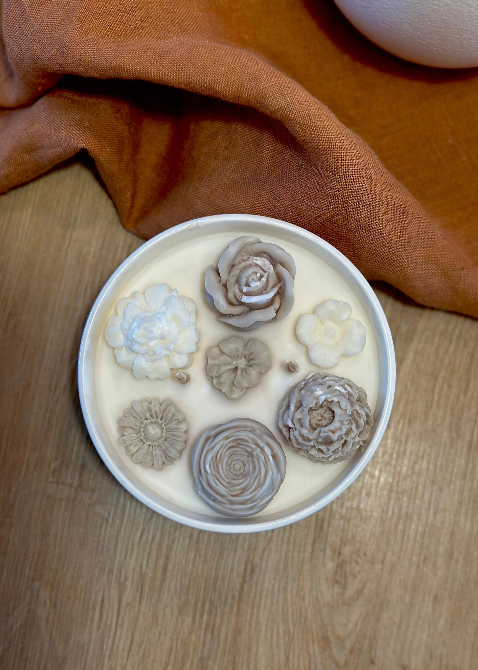 Cette bougie en cire de soja est ornée de délicates fleurs en cire qui se fondent lentement sous la chaleur de la flamme.